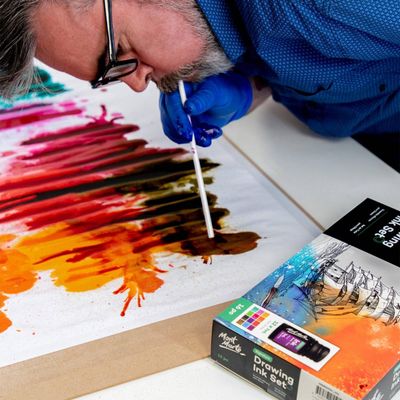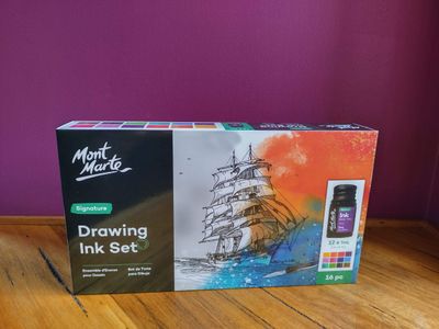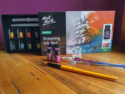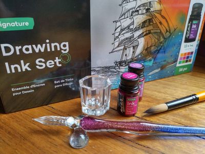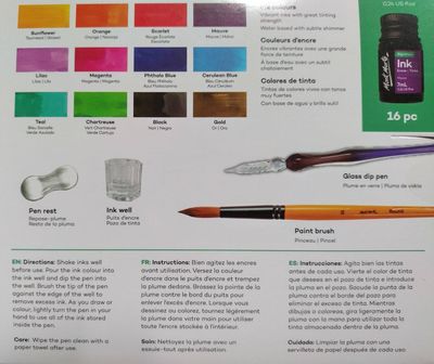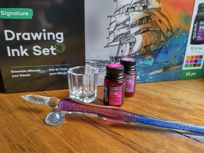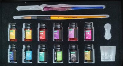 Dip into the world of ink with our Drawing Ink Set 16pc. Everything you need is inside the set, including inks, a glass dip pen, an ink well, a brush and pen rest. The vibrant ink colours have a smooth flow, great tinting strength and a subtle shimmery finish. Plus, theyβre fast drying and smudge-proof once dry to help keep your artwork looking its best. Weβve also added a glass dip pen for fine detail work and more ink mileage. This fluid medium is suitable for illustration, calligraphy, and painting and the inks can be used with other painting and drawing medium